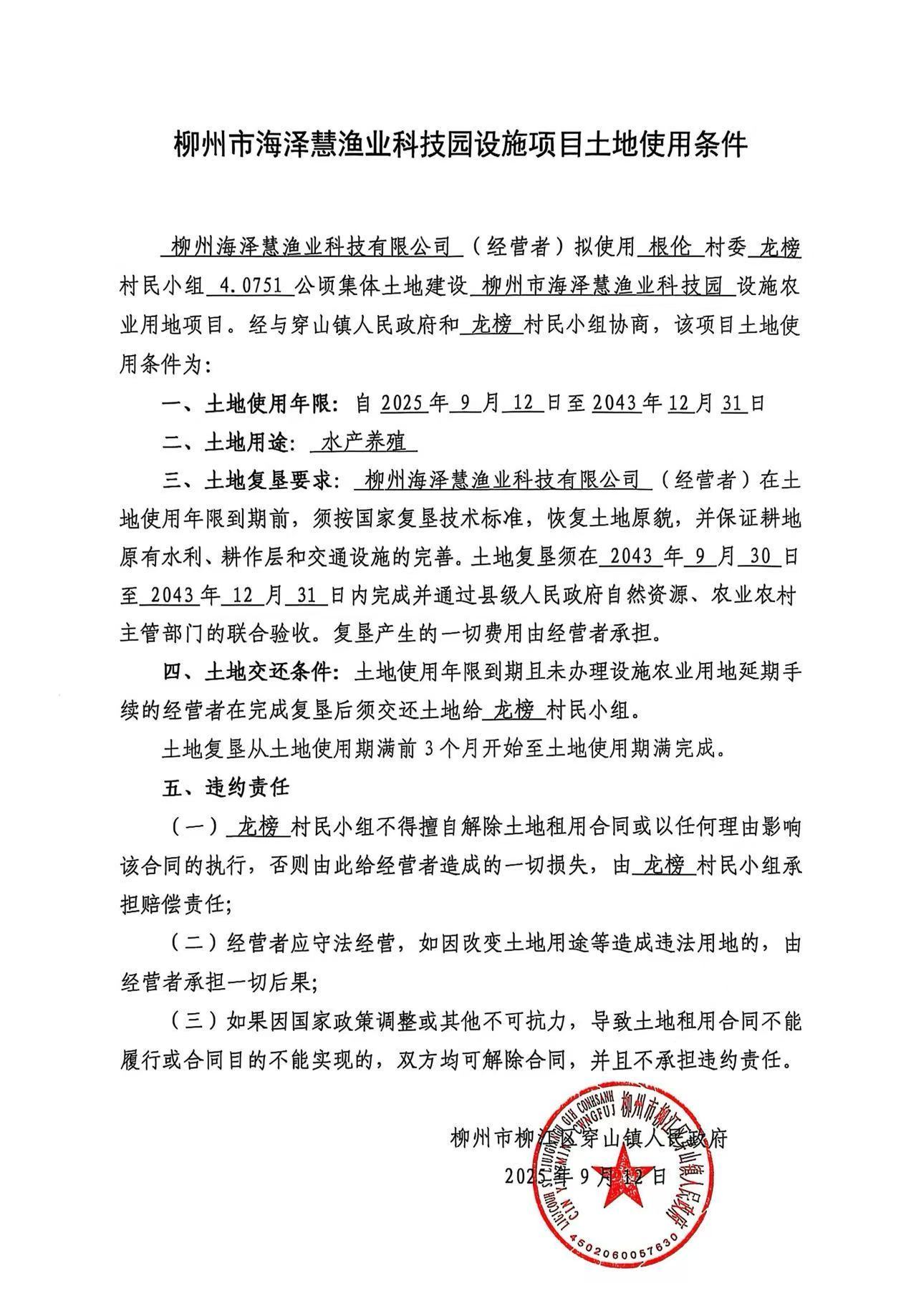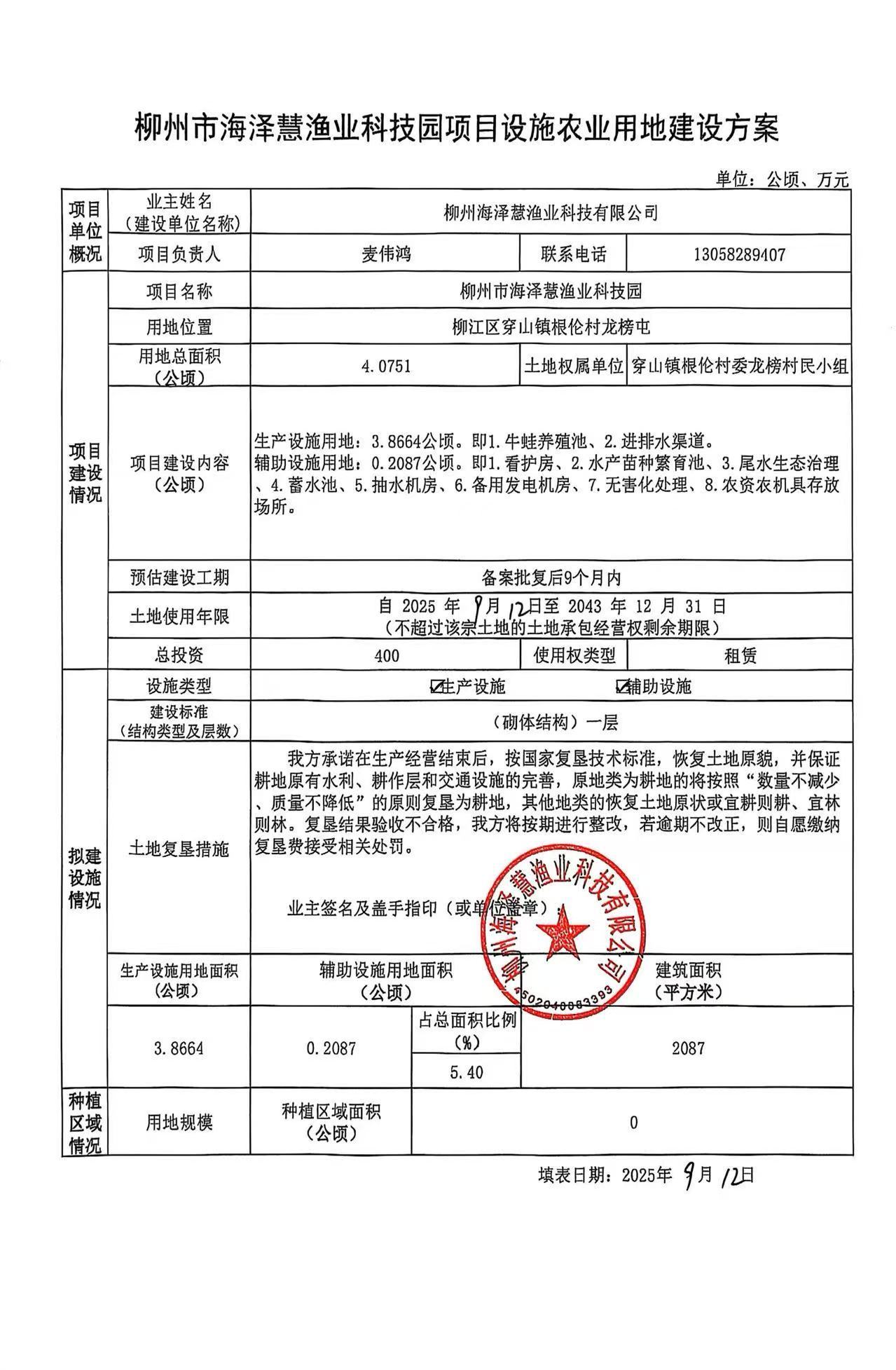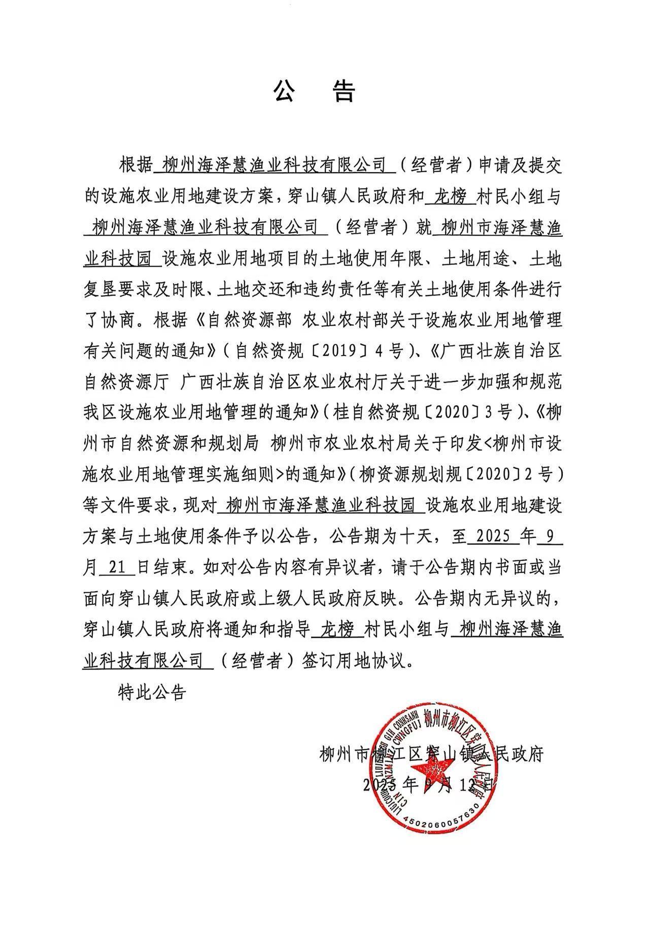 【穿山鎮】柳州市海澤慧漁業科技園設施農業用地項目公告